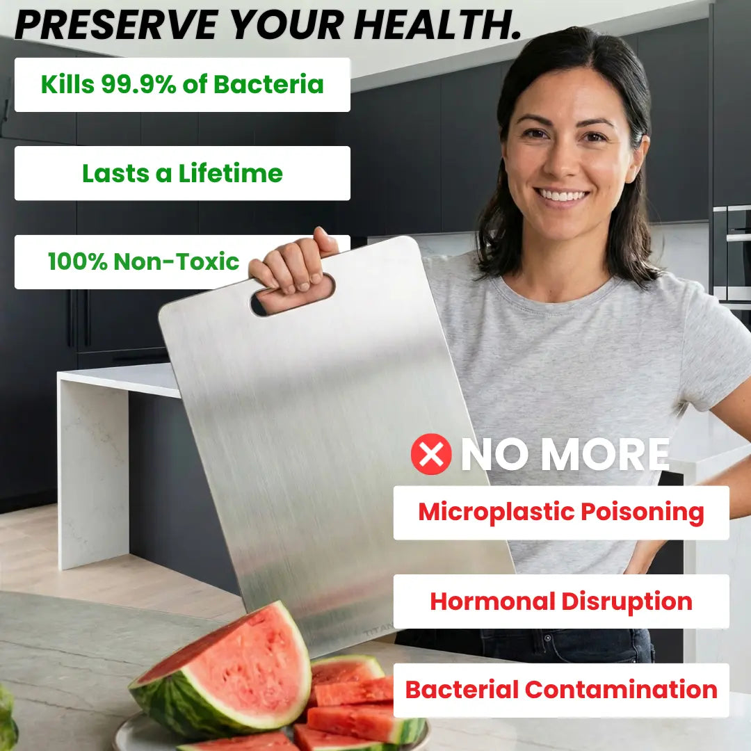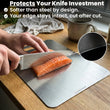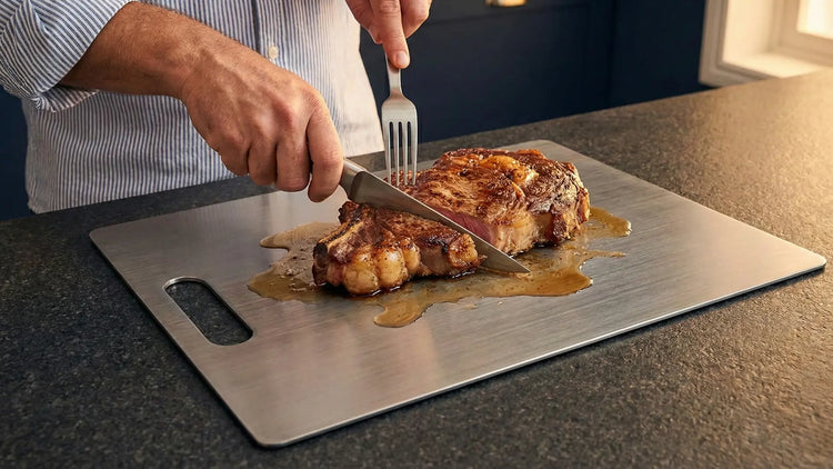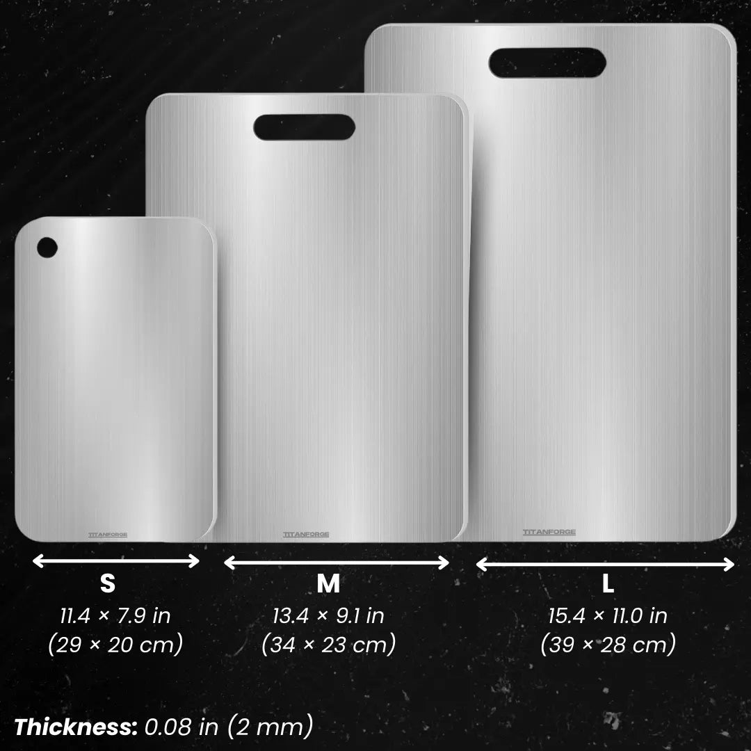 Titanium cutting boards are engineered to keep your knives sharper for longer. The titanium surface is softer than your blade, so it won’t cause dulling. It provides the knife-friendly benefits of wood, without the drawbacks like bacteria buildup, warping, or odor retention.